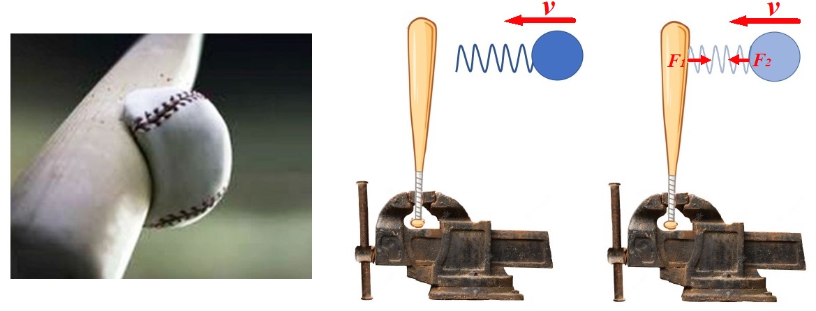 Slika 3. Sudar loptice s palicom Sili kojom loptica djeluje na palicu po 3. Newtonovom zakonu suprostavlja se sila kojom palica djeluje na lopticu, istog iznosa a suprotnog smjera. Ipak loptica se zamjetno deformira.