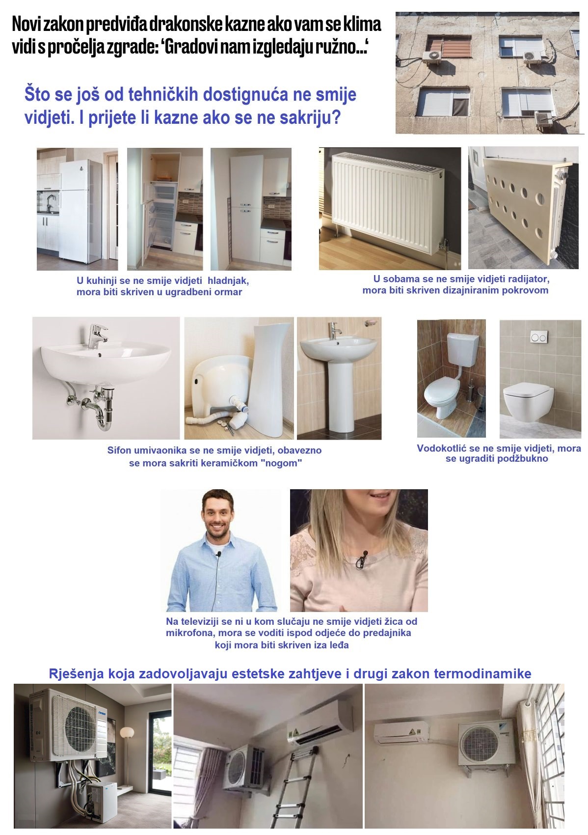 Od 1. siječnja 2025., u Hrvatskoj stupila su na snagu nova pravila koja se odnose na montažu klima uređaja na pročeljima zgrada, a koja imaju za cilj unaprijediti vizualni identitet urbanih sredina i zaštititi estetsku vrijednost zgrada. Prema novom pravilniku, nije dopušteno postavljanje vanjskih jedinica klima uređaja na pročelja zgrada koje su okrenute prema javnim prostorima. To uključuje sve strane zgrada koje su vidljive s ulice ili javnog mjesta, s posebnim naglaskom na povijesne i kulturne jezgre gradova te naselja koja imaju visoku estetsku i kulturnu vrijednost. Pravilnik predviđa kazne za vlasnike stanova, upravitelje zgrada i tvrtke koje se bave montažom klima uređaja, a koji ne poštuju nova pravila.