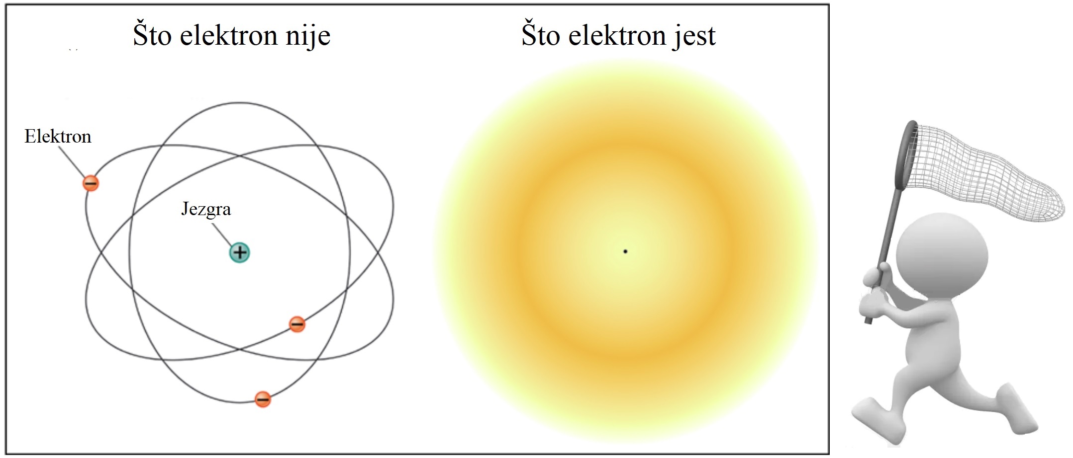 U srijedu sam u dvorani gradske knjižnice u Križevcima slušao popularno predavanje za javnost koje su održali dvojica znanstvenika, Ivica Puljak i Toni Šćulac. Profesor Puljak, u nastojanju da fascinira slušatelje, opisao je atom kao česticu koja se sastoji od jezgre i elektrona između kojih "nema ničega" tj. kao potpuno prazan prostor. Za dojmljivu ilustraciju osmislio je hipotetsku predodžbu: "Ako bismo iz tijela svih ljudi na svijetu uzeli elektrone i jezgre atoma bez praznog prostora između njih oni bi zauzimali volumen veličine jedne kocke šećera." Pri tome je na zaslonu pokazao žlicu s kockom šećera za potvrdu te prispodobe. Je li ta slika dobra? Mi znamo da atom nije "prazan" nego je ispunjen elektronskim oblakom. Bez tog razmazanog elektrona ne bi bile moguće kemijske veze. Uostalom zašto onda rješavamo Schrödingerovu jednadžbu.