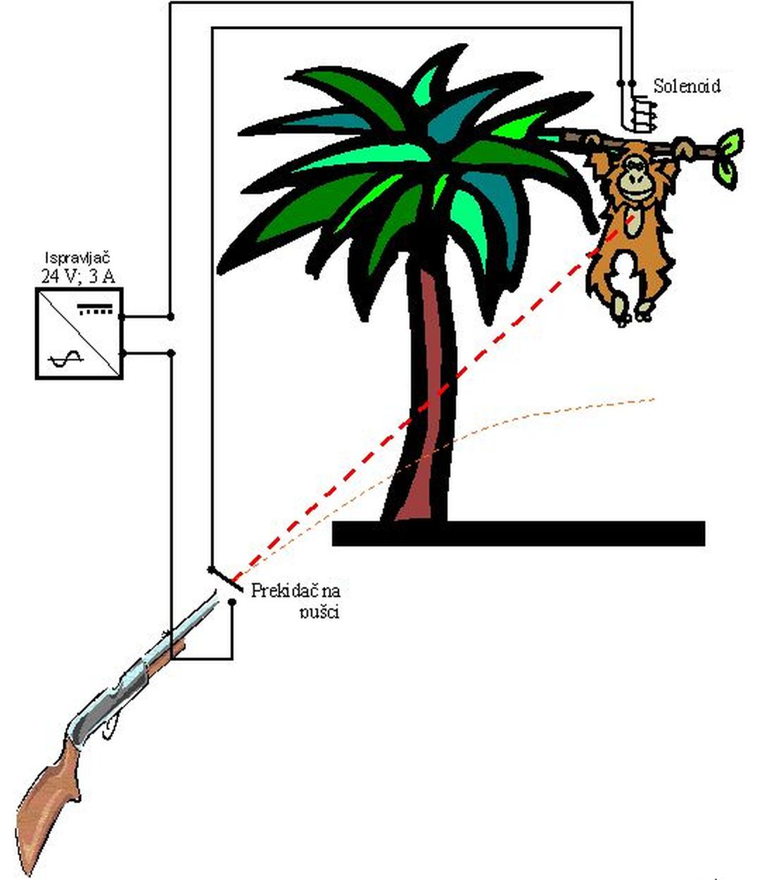 Lovac uoči majmuna kako visi s grane drveta, uperi pušku ravno u majmuna i opali. Majmun "razmišlja", ako se pustim padati dok metak stigne do mene ja ću već biti puno niže i metak će mi proći iznad glave. Zato, čuvši pucanj, u istom trenutku pušta granu nadajući se da će izbjeći metak padom na tlo. Hoće li ga metak promašiti? Neočekivani odgovor je "neće": metak će uvijek pogoditi majmuna, bez obzira na kut puške, brzinu metka ili udaljenost do majmuna, sve dok je majmun u dometu metka.