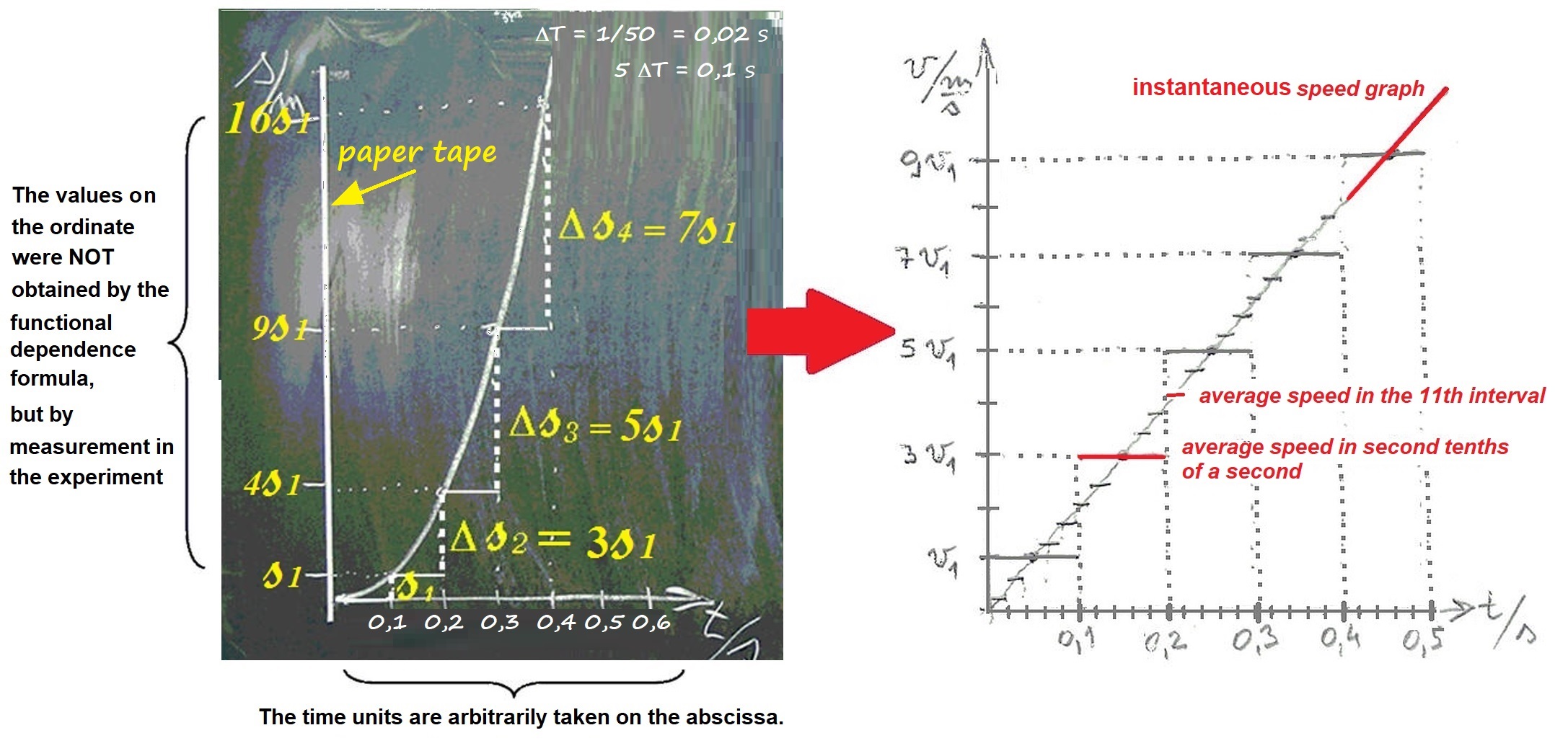 The values on the ordinate were NOT entered using the well-known formula s = g·t²/2, as they were clearly from the experiment. This is a significant difference between physics and mathematics. The physicist must now determine the functional dependence obtained during the experiment. We will be able to determine how this dependence is quadratic with our mathematical knowledge. That is to say, a distance traveled in twice the time is four times longer than a distance traveled in first time unit, etc. The numbers 4, 9, 16, 25,... are all squares. And the paths covered within certain intervals increase linearly as odd numbers. The distance traveled in the second tenth of a second is three times longer than that in the first tenth, the distance in the third tenth is five times longer, etc. s1, 3s1, 5s1, 7s1, (Figure 2.)
