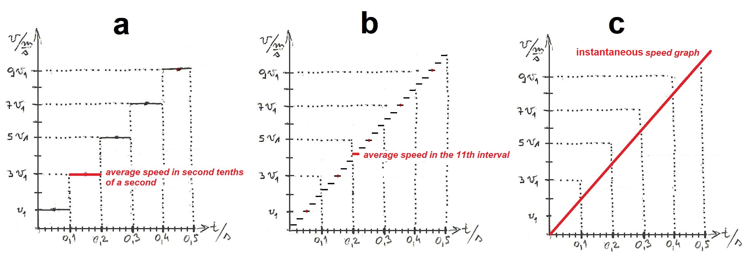 Using the above procedure, we will obtain "stairs" of average speeds in a single unit of time, 0.1 s, on the v-t graph. (See Figure 3, a.) The "stairs" are obviously rough. Now, let's try drawing such "stairs" using 1/50 of a second as a unit of time. (See Figure 3 b). It is clear that the "stairs" have become finer. And if we try to draw the "stairs" for every millionth of a second, we will be unable to distinguish them because they are finer than the thickness of the chalk we are using, resulting in a straight line of instantaneous speeds. (See Figure 3, c.)
