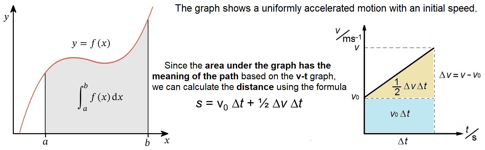 The same is true for tasks that require drawing a lower graph from a higher graph (by degree of derivation). A very common task is to draw a s-t graph from a given v-t graph. And as an aid it is said that the surface beneath the graph have a meaning of the path traveled. This statement is actually an instruction for a definite integral that has been simplified to polygons because the motions are uniform.