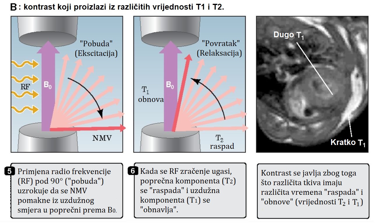 Tajna je u okolini. Proces povratka u ravnotežu zovemo relaksacija. U masnim tkivima se to događa brzo (kratko T1 vrijeme), dok se u vodi ili upalnom tkivu događa sporo (dugo T1 vrijeme). Računalo te milisekundne razlike pretvara u kontrast na slici.