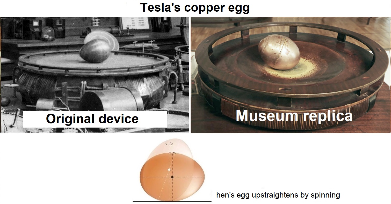 Tesla's spinning magnetic field is just the driving force behind the copper rotor's revolution, and egg was straightened as a result of a well-known phenomena that occurs when a hen's egg on a flat surface stand upright during sufficiently fast rotation. In his childhood, Tesla witnessed how an egg was turned manually to assess whether it was cooked or raw. The cooked one would spin and stand up, whereas the raw one would slow down. A raw egg cannot raise its center of gravity because the angular velocity of the shell must be transferred to the fluid interior. As a result, the majority of the original kinetic energy is lost, and the residual energy is insufficient for the egg to achieve gyroscopic equilibrium.