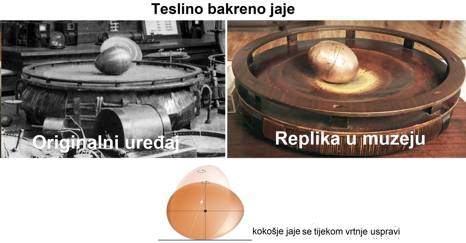 Teslino okretno magnetsko polje pri tome je samo pogon za vrtnju bakrenog rotora, a za uspravljanje mu je poslužila poznata pojava koja se očituje i kada se kokošje jaje na ravnoj podlozi uspravi tijekom dovoljno brze vrtnje. Vidio je to još u djetinjstvu kada se ručno pokrenutom vrtnjom utvrđivalo je li jaje kuhano ili sirovo. Kuhana bi se u vrtnji uspravila, a sirova usporavala. Sirovo jaje neće se uspraviti, jednostavno zato što se kutna brzina koju ima ljuska mora prenijeti na tekuću unutrašnjost sirovog jajeta. Pri tome se većina početne kinetičke energije rasipa i preostala energija nije dovoljna za uspostavljanje žiroskopske ravnoteže.
