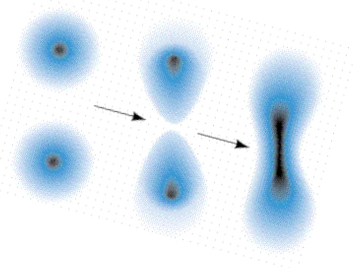 Gdje je Ĥ Hamiltonov operator (koji predstavlja ukupnu energiju), Ψ je valna funkcija (koja opisuje kvantno stanje elektrona), a E je energija elektrona. Kvadrat valne funkcije, |Ψ|², daje gustoću vjerojatnosti pronalaska elektrona u određenoj točki u prostoru. Ova distribucija vjerojatnosti nalaženja je elektronski oblak (ili orbitala). Rješenja jednadžbe nam, dakle, daju dopuštene energije elektrona te oblik i veličinu elektronskog oblaka, što određuje kako se atomi vežu i međusobno djeluju (npr. u kemijskim reakcijama). Elektronski oblak je izvor Paulijevog principa isključenja i elektrostatskog odbijanja koje čvrstim tijelima daje krutost i volumen. Kada se dva atoma približe, njihovi oblaci elektrona međusobno djeluju i prožimaju se. Ovo prožimanje, kojim upravljaju oblici orbitala pronađenih rješavanjem Schrödingerove jednadžbe, stvara kemijske veze (kovalentne, ionske, metalne) i određuje međuatomski razmak i strukturu sve materije. Kada bi atomi bili samo točkaste jezgre i čestice (kao što Puljkova analogija s kockom šećera sugerira), ne bi postojao mehanizam odbijanja potreban da makroskopski objekti ne kolabiraju u jednu super gustu masu, pa ne bi bilo ni kemije kakvu poznajemo. Ukratko, prostor atoma nije prazan – ispunjen je potencijalnom energijom i raspodjelom vjerojatnosti elektrona, koje temeljno definiraju kemijska svojstva atoma i njegovu fizičku veličinu.