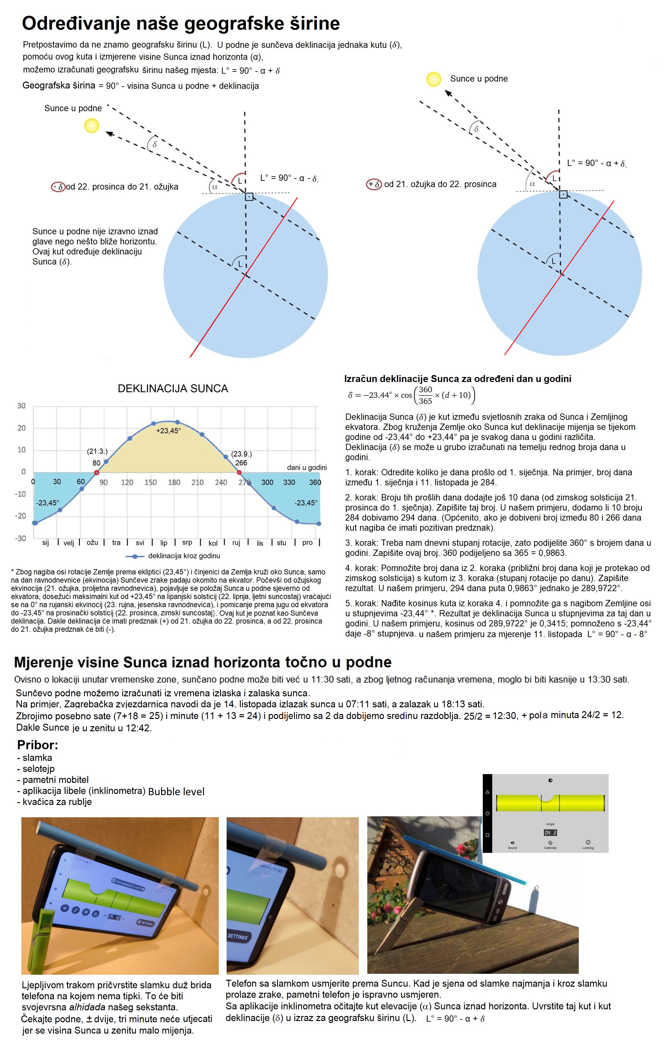 Iako se geografska širina može brzo i lako saznati traženjem na internetu, kao i deklinacija Sunca za određeni dan u godini, učenici ipak mogu nešto naučiti iz geografije i fizike ako širinu izmjere sami.