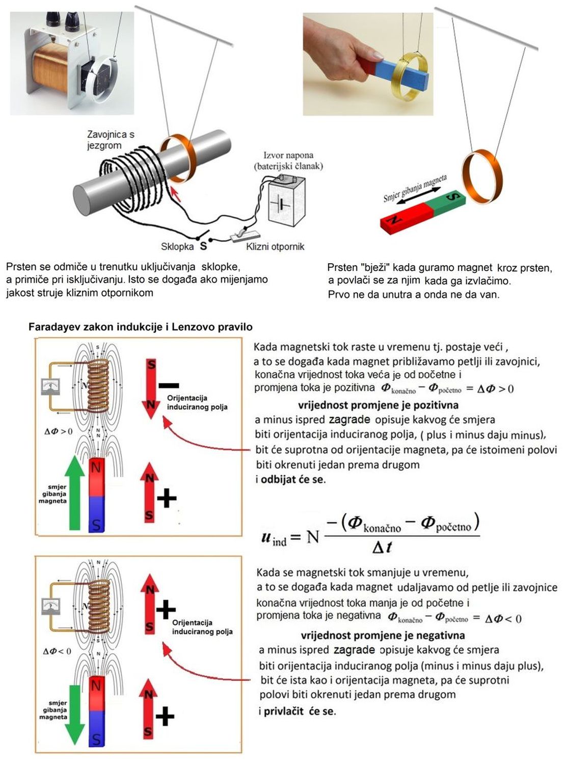 Koja sila pomiče prsten kroz koji guramo ili povlačimo magnet? Što opisuje predznak minus (-) u formuli za inducirani napon?