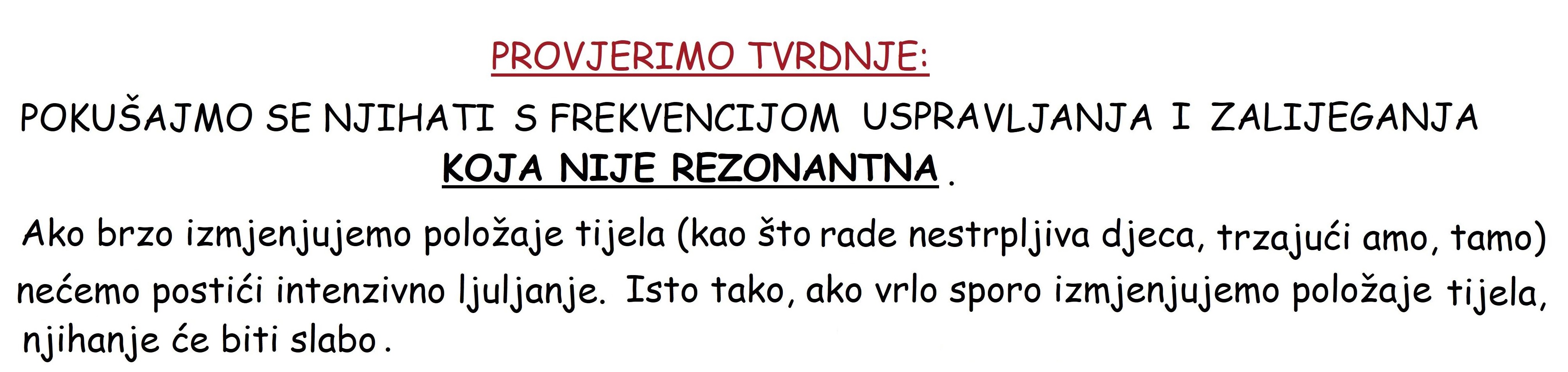 Djeca nekako intuitivno nauče uživati u njihanju bez posebnih objašnjenja fizike kojom opisujemo takvo gibanje. Ipak u učionici možemo ljuljačku uzeti za primjer rezonancije. Obično se ona uzima za primjer prisilnog titranja nekim vanjskim djelovanjem periodične sile. No djeca to postižu sama.