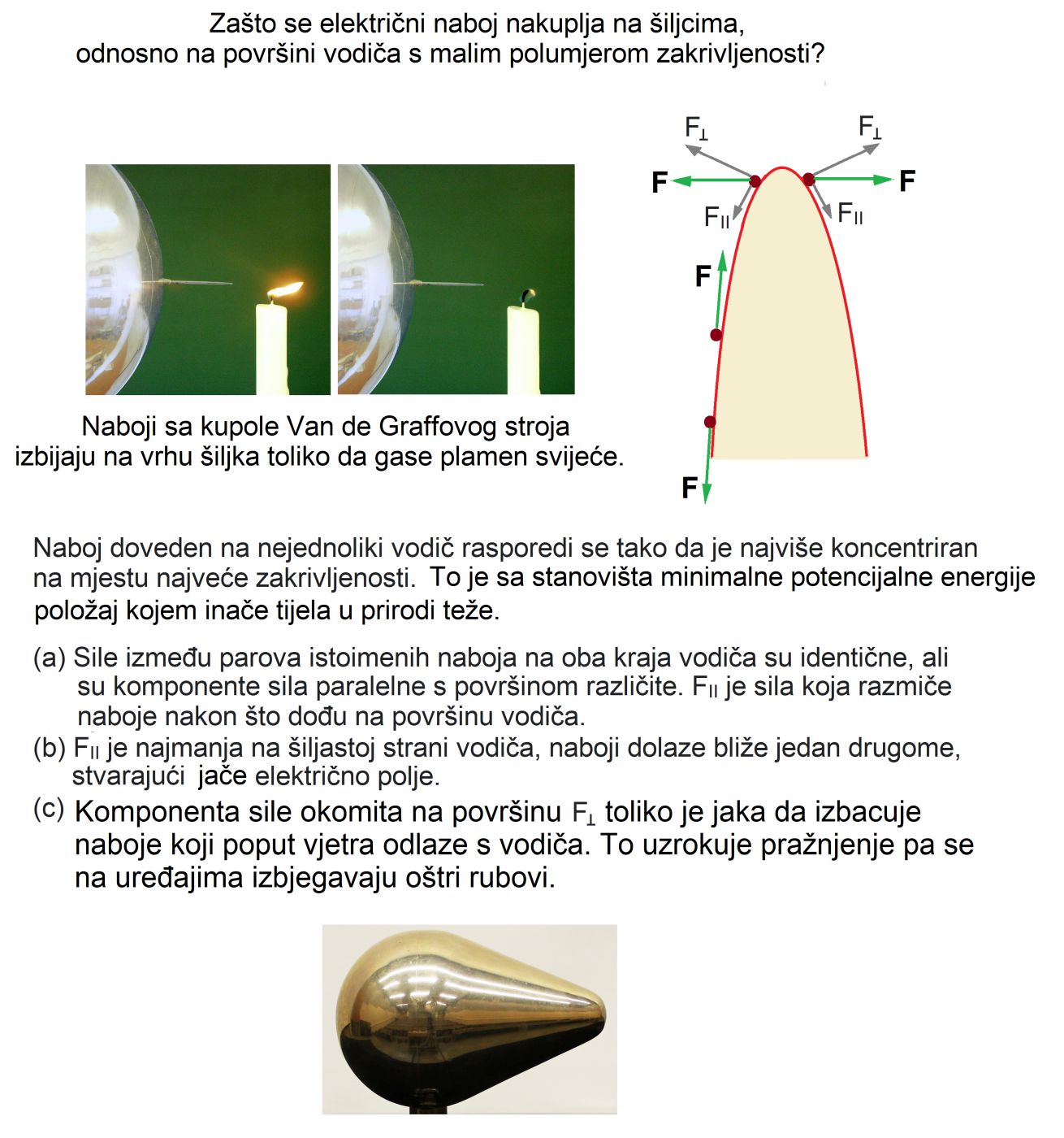 Često sam od učenika (a i nastavnika) čuo tvrdnju da se električni naboji skupljaju na šiljku "zato jer je tamo najjače električno polje". Ta izjava zamjenjuje uzrok i posljedicu. Naime na šiljku je najjače električno polje baš zato što je tamo koncentracija naboja najveća. A zašto se naboji baš tamo nakupljaju? Očito je iz nekog razloga tamo njihova potencijalna energija najmanja. Tj. ta raspodjela na vodiču je energetski najpovoljnija.
